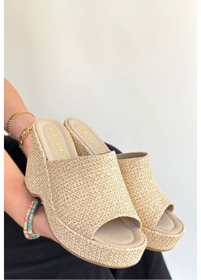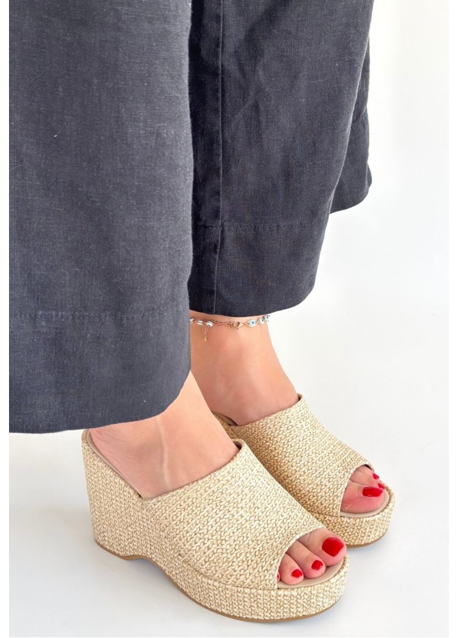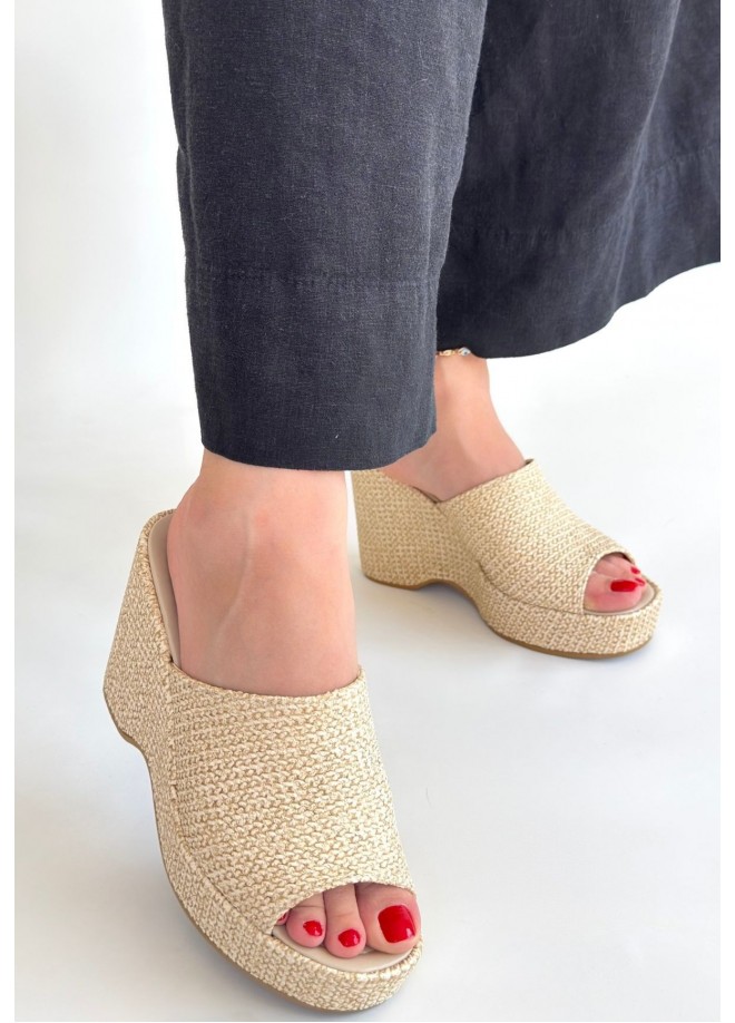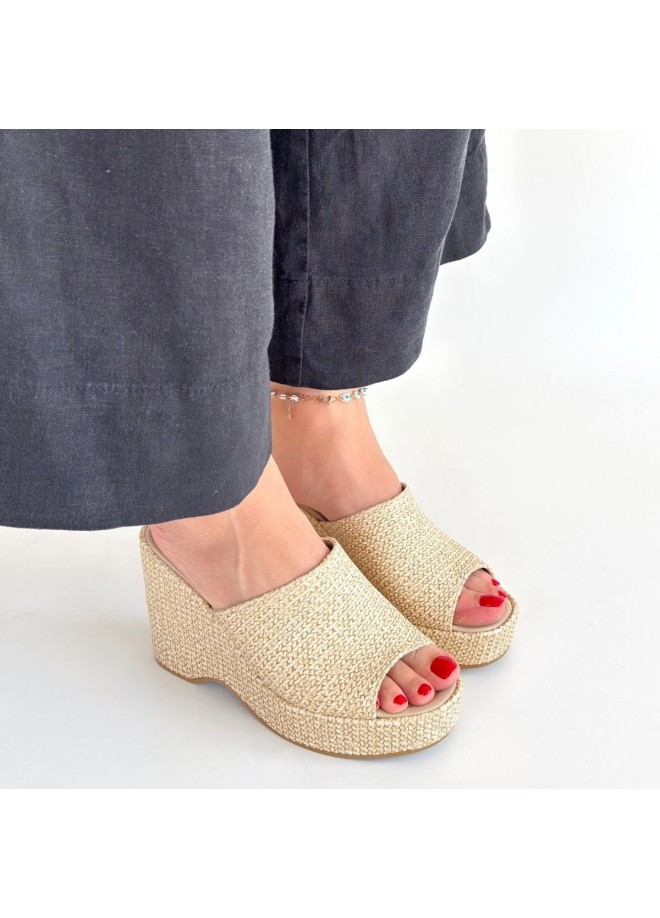 Tlay Bej Hasır Dokumalı Dolgu Topuk Terlik
