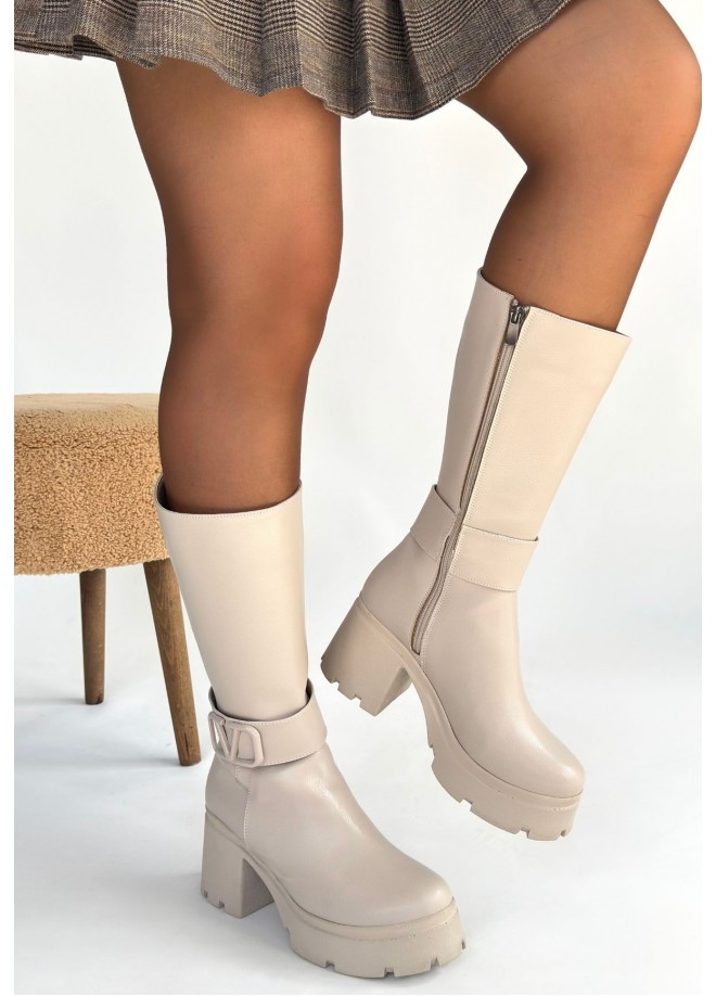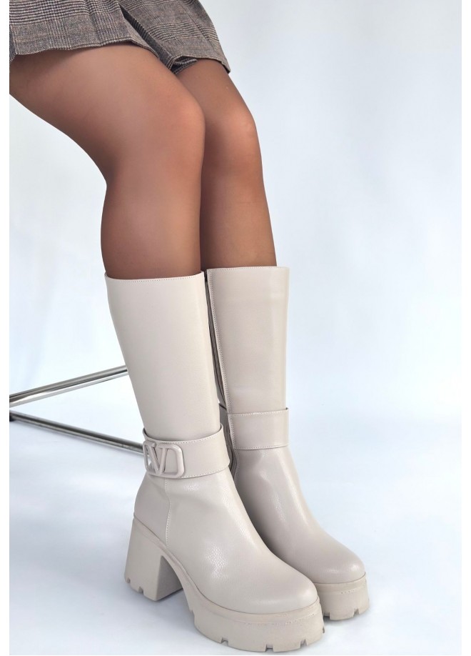 Moki Bej Cilt Topuklu Çizme