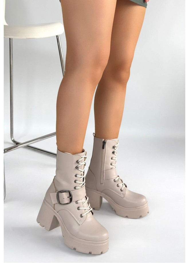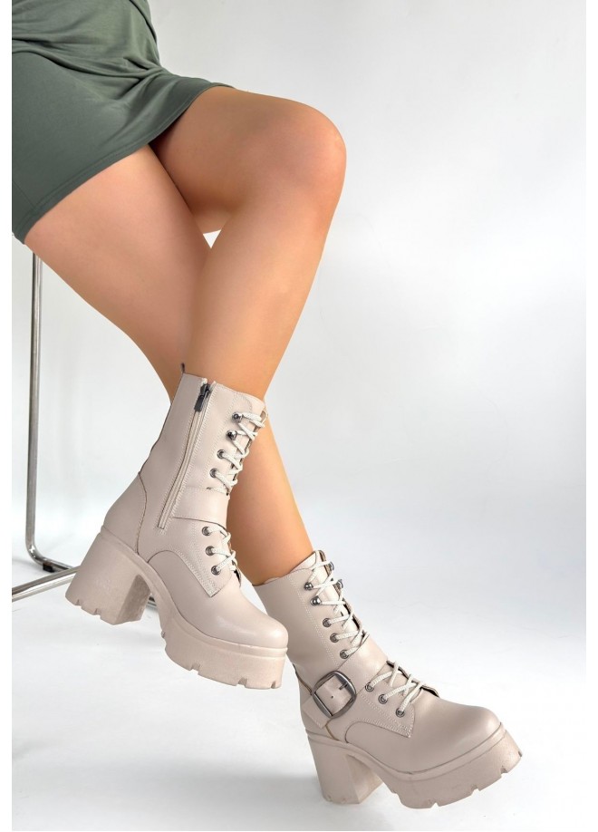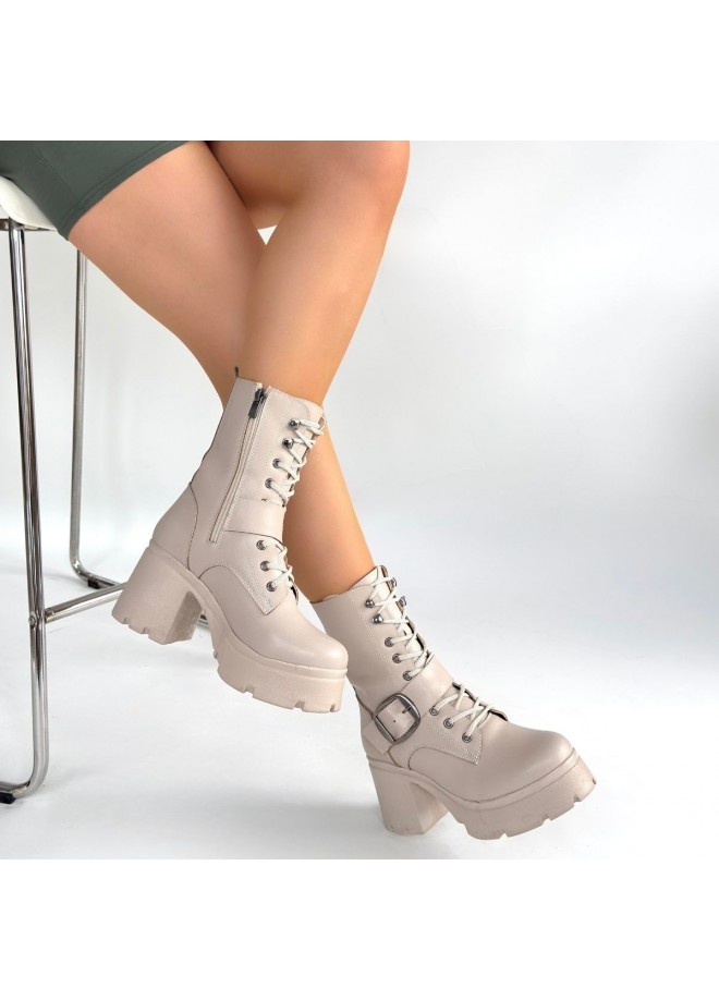 Linma Bej Cilt Bağcıklı Topuklu Bot