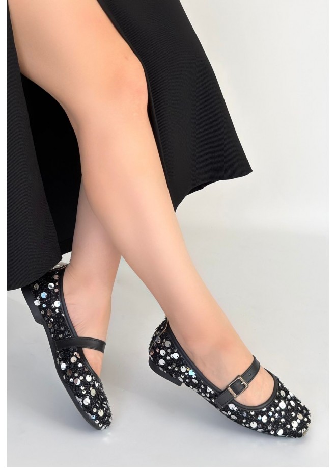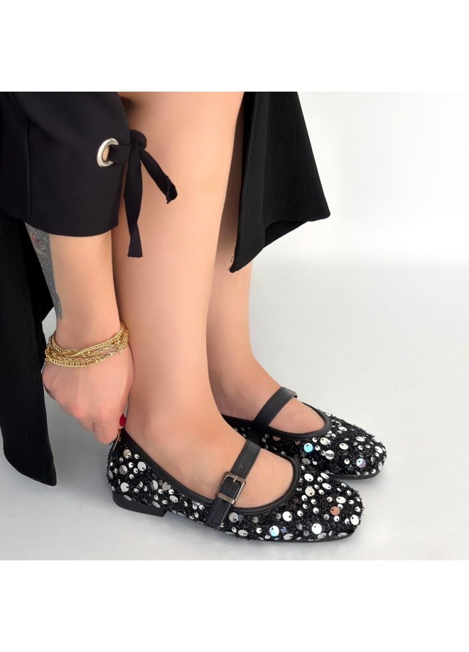 Zaty Siyah Süet Gümüş Pullu Babet Ayakkabı