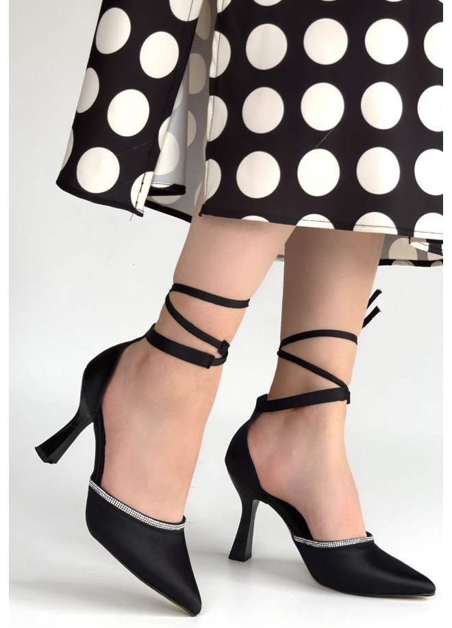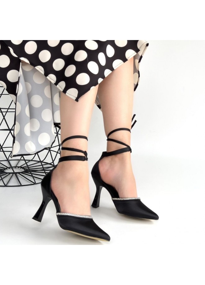 Tenja Siyah Saten Bilekten Bağcıklı Topuklu Ayakkabı