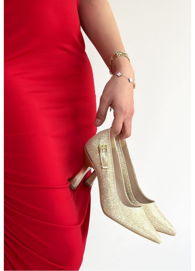 Cerin Gold Saten Simli Topuklu Ayakkabı