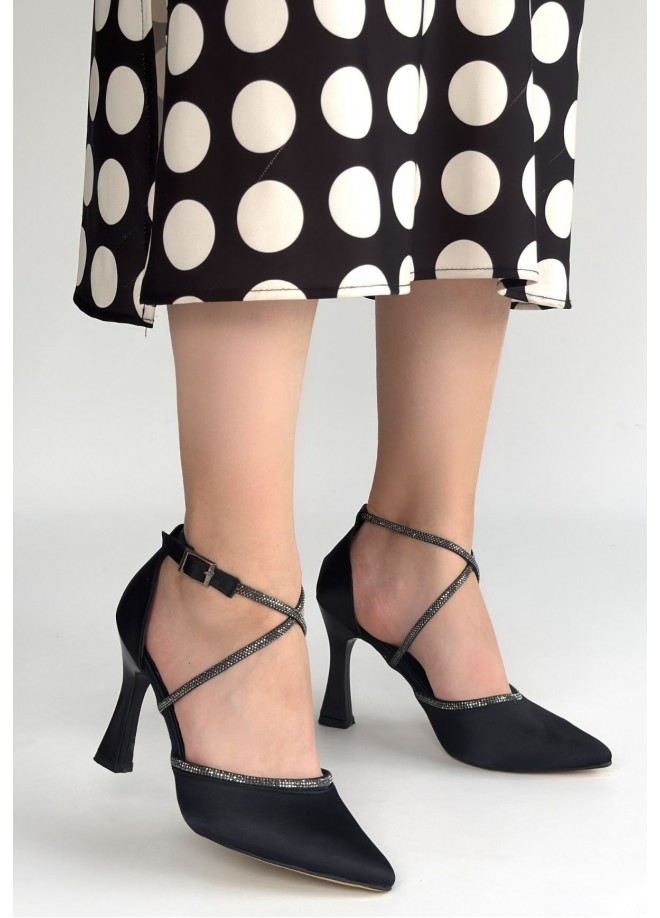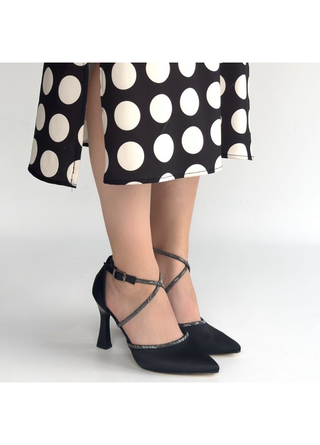 Kanji Siyah Saten Topuklu Ayakkabı