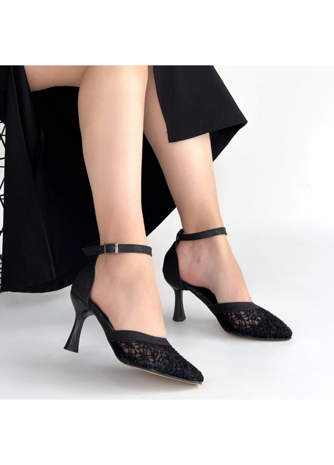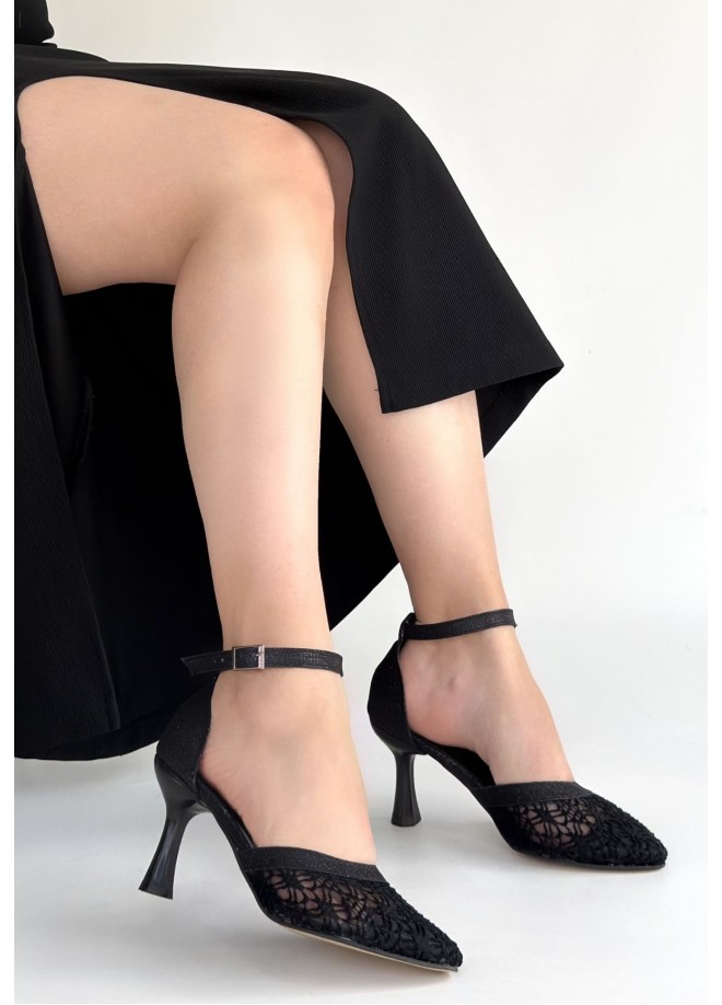Weja Siyah Cilt Tül Detaylı Topuklu Ayakkabı