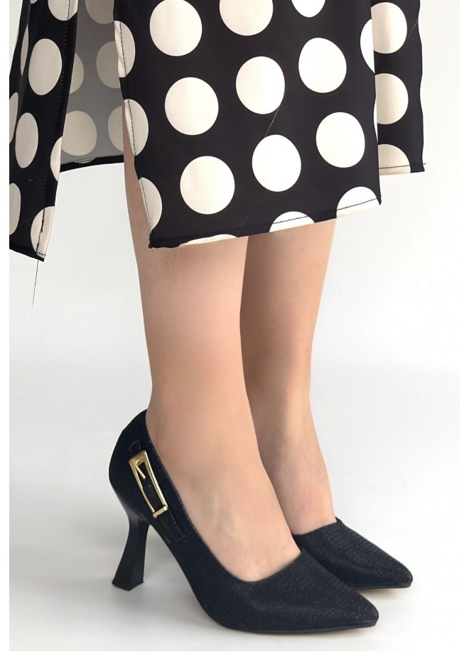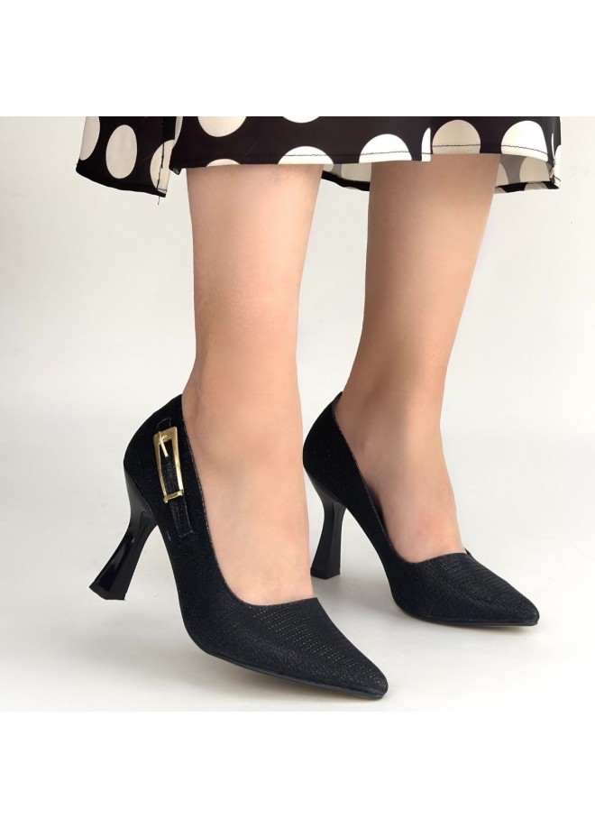 Cerin Siyah Saten Simli Topuklu Ayakkabı