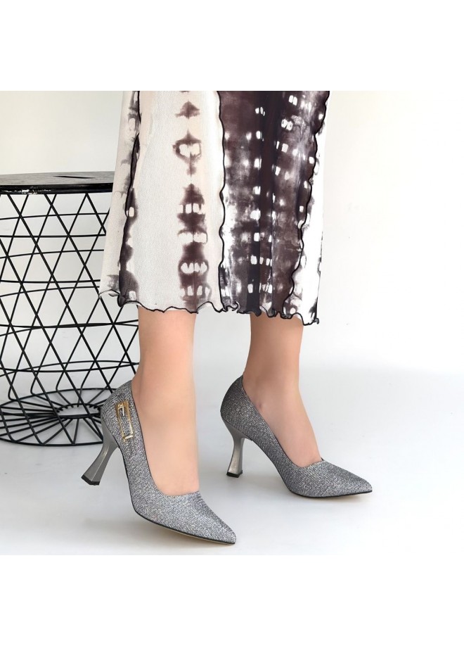 Cerin Gümüş Saten Simli Topuklu Ayakkabı