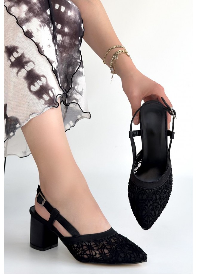 Poje Siyah Saten Tül Detaylı Topuklu Ayakkabı