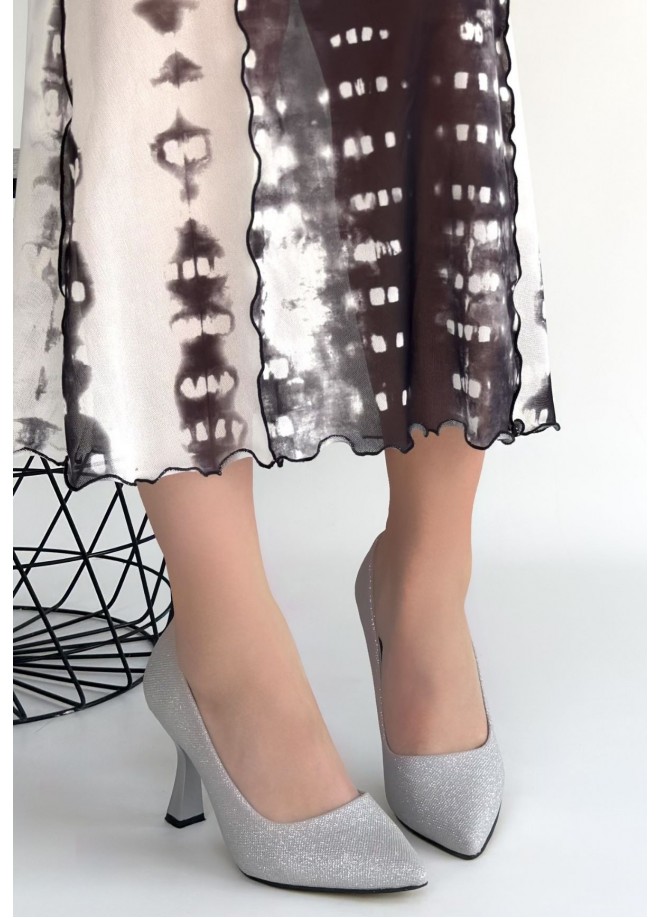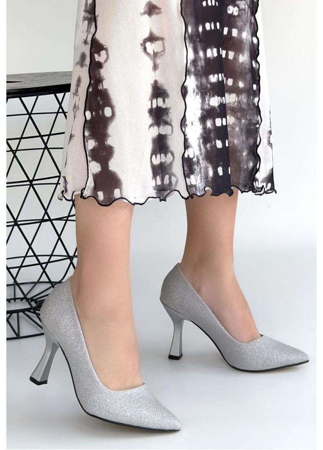 Meyli Gümüş Saten Simli Topuklu Ayakkabı