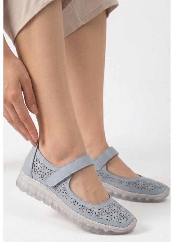 Sina Mavi Deri Cırt Cırtlı Babet Ayakkabı