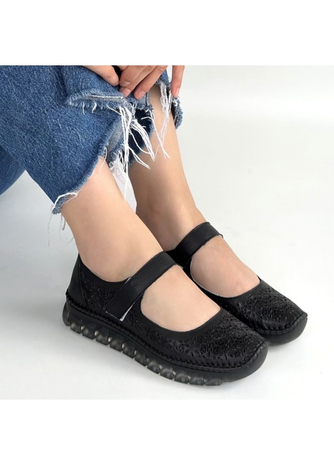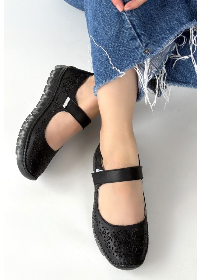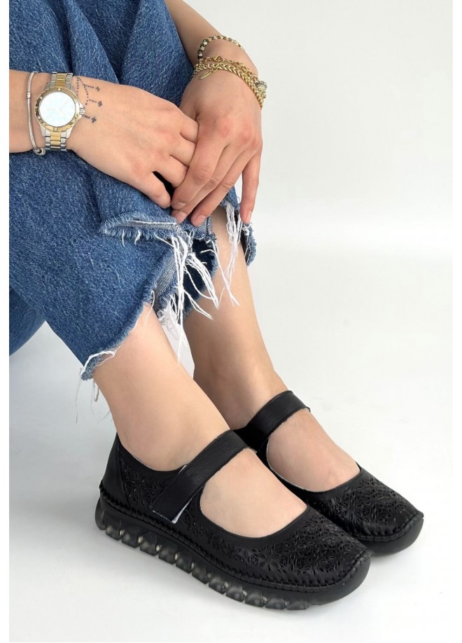 Sina Siyah Deri Cırt Cırtlı Babet Ayakkabı