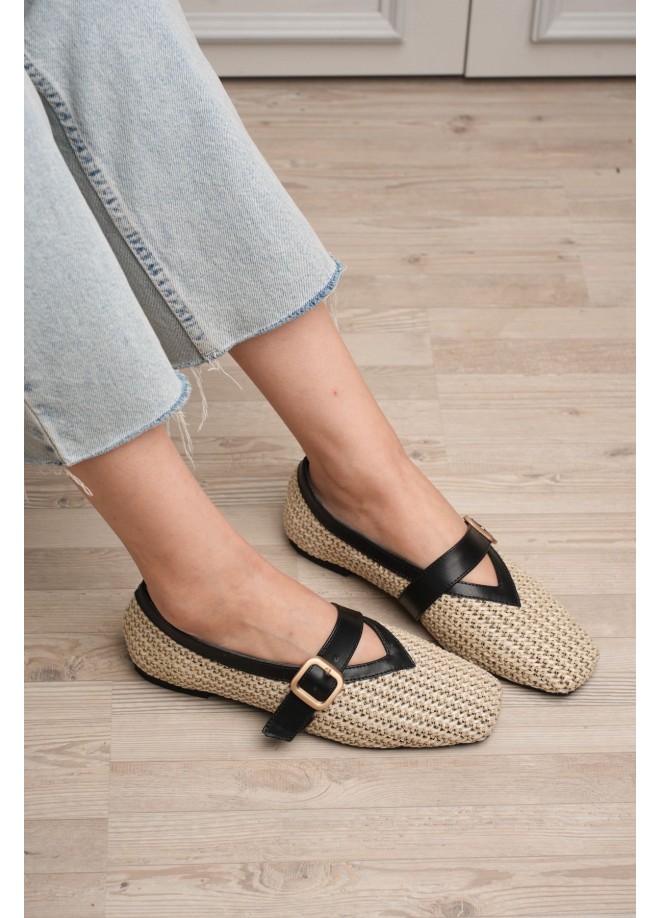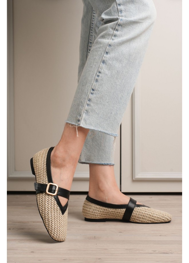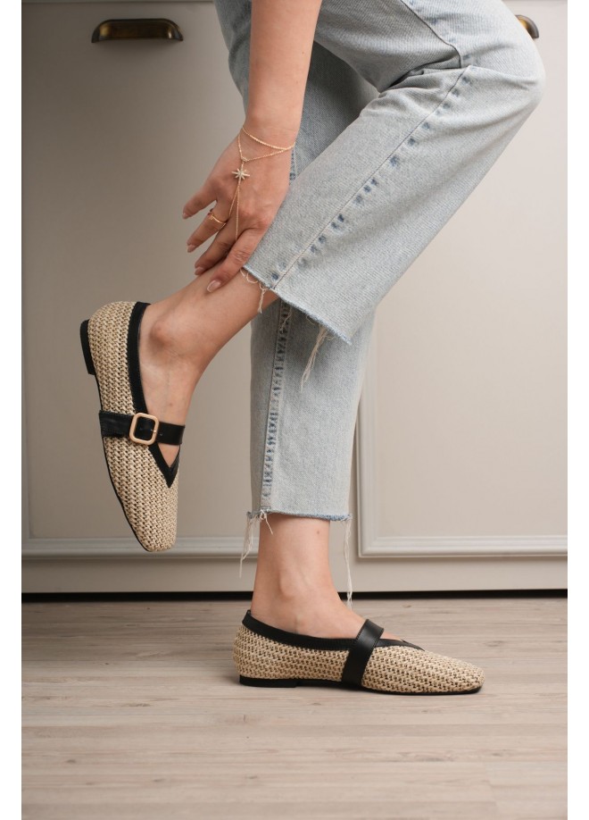 Ponti Siyah Cilt Hasır Detaylı Babet Ayakkabı